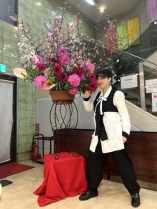 エントランスに飾られた鮮やかなお花の隣で写真を撮りました💐