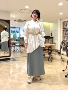 ライトブルーのサテンスカートに変形シャツを合わせて気分は春先取り!💓