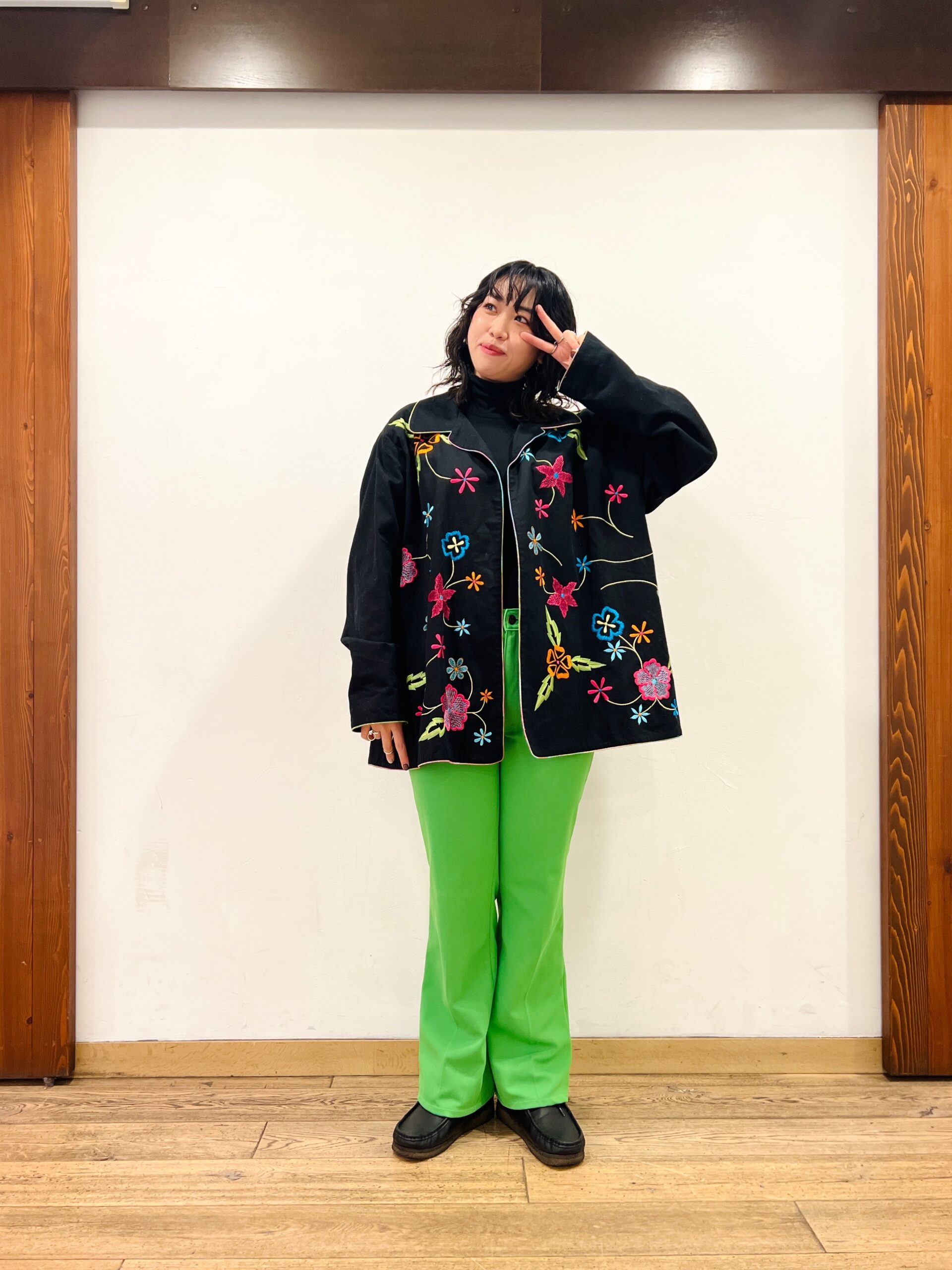 休日立ち寄った古着屋で購入したお花の刺繍が可愛い羽織に合わせ、