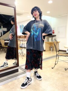 その日の服装でテンションが左右されるので、今日はTシャツもスカートも古着!