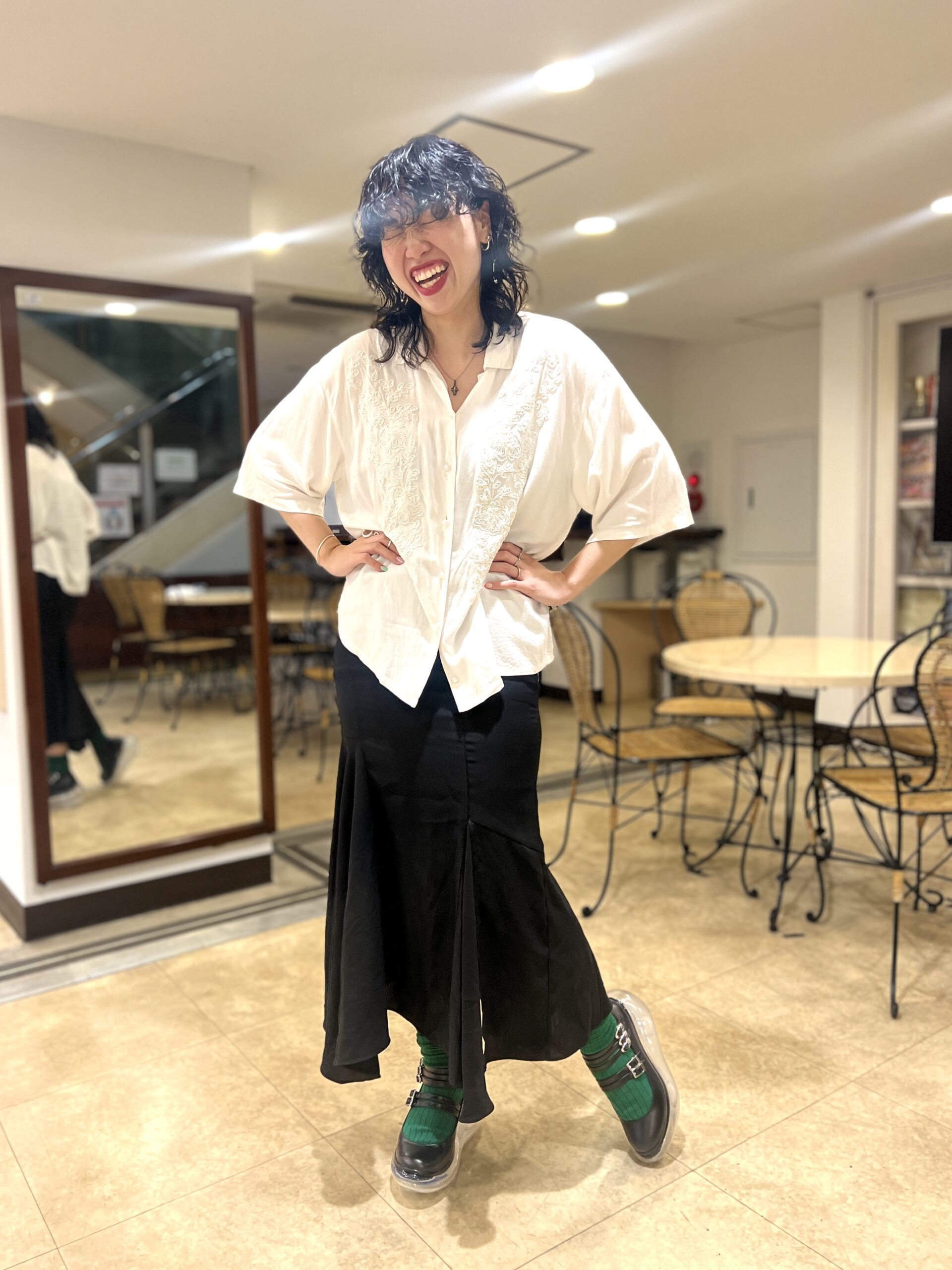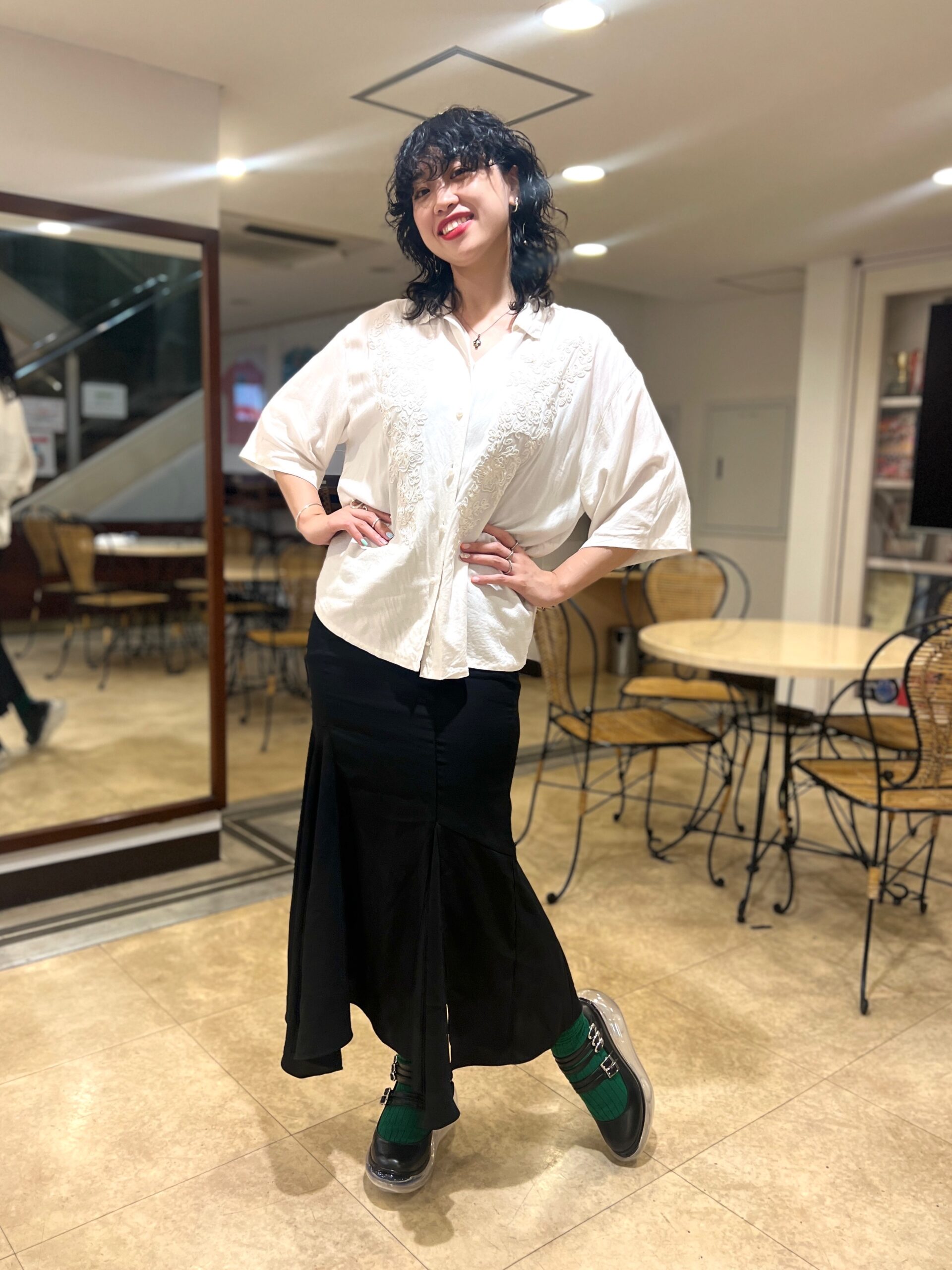 シャツは古着、スカートは女性らしいシルエットにしたかったので