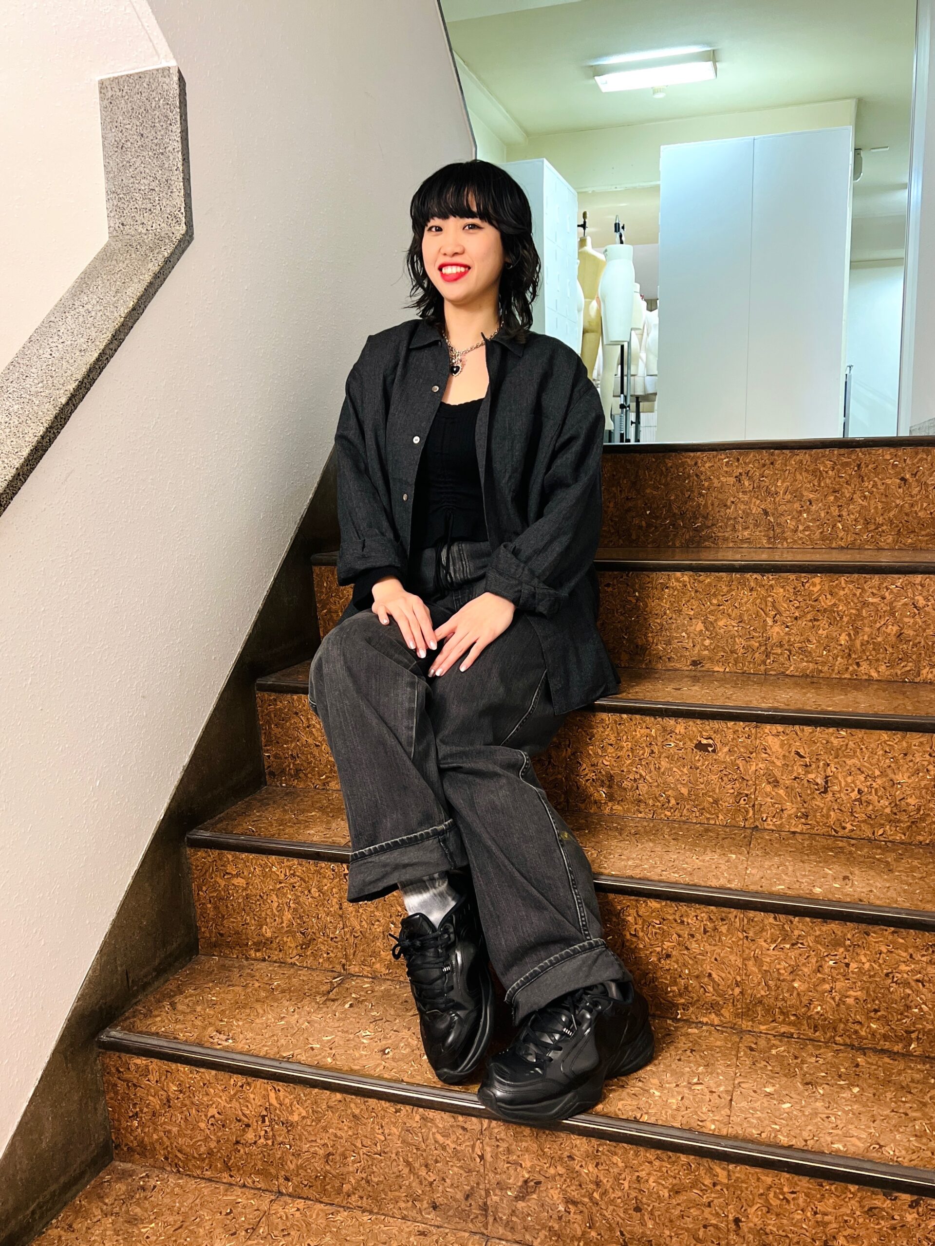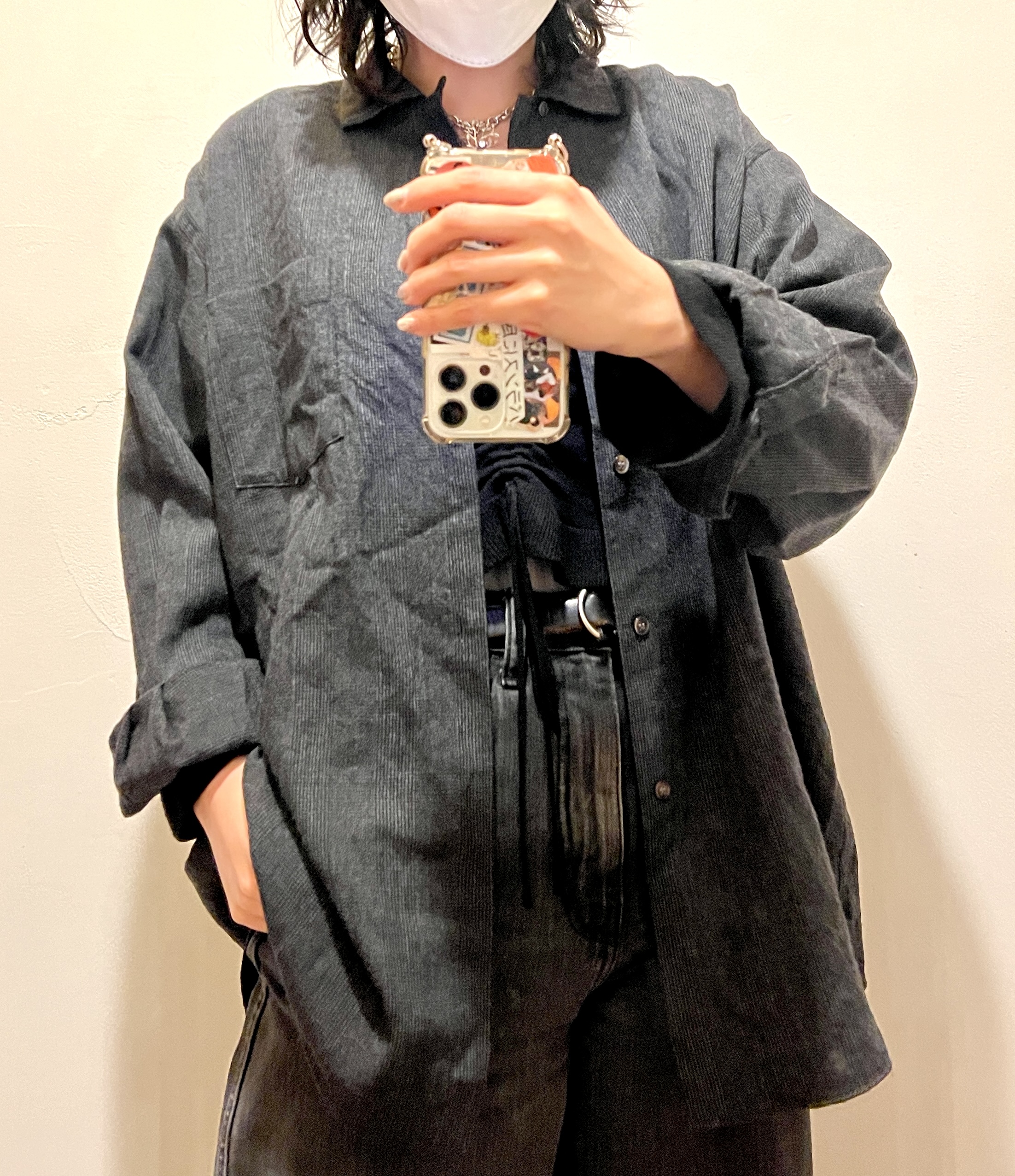 足元までの全身、黒を基調とした一見メンズコーデのようですが!