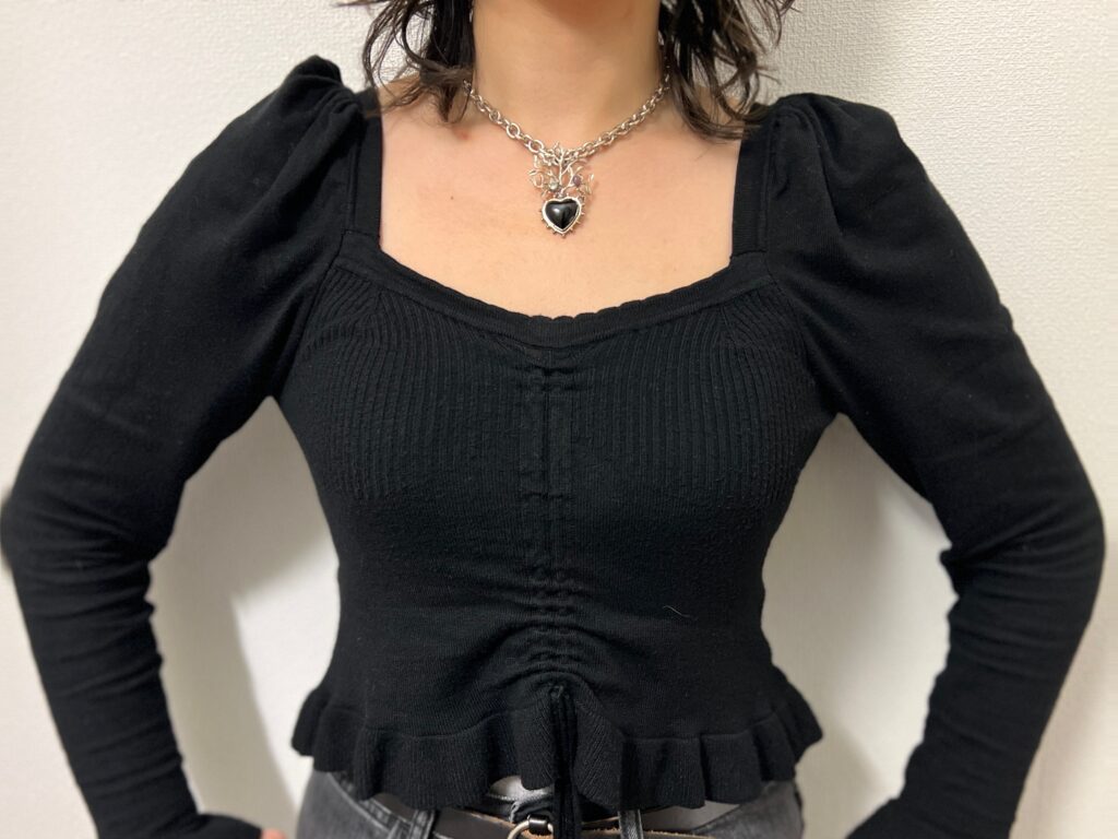 脱ぐと、パフスリーブが女性らしさを演習し首元にはハートのネックレス🖤