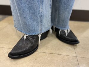 雰囲気が出るように、フレアのデニムにウエスタンブーツを履いてきました。
