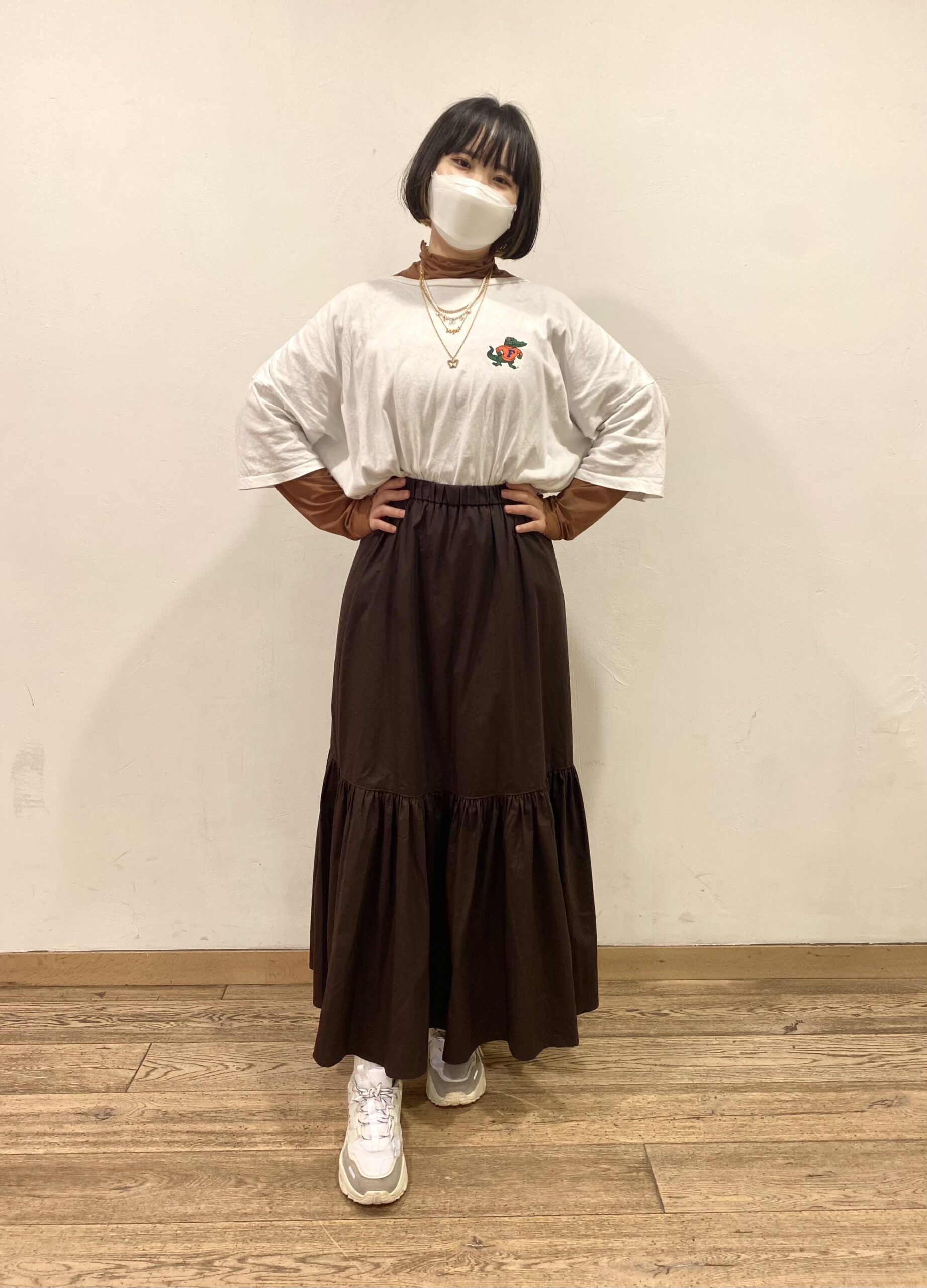 ブラウンのスカートにトップスのインナーもブラウンで揃えました🤎適当でも色遣いは忘れません!