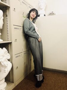 全体の色味のトーンをあげたかったので、ボトムスはグレーにしました。