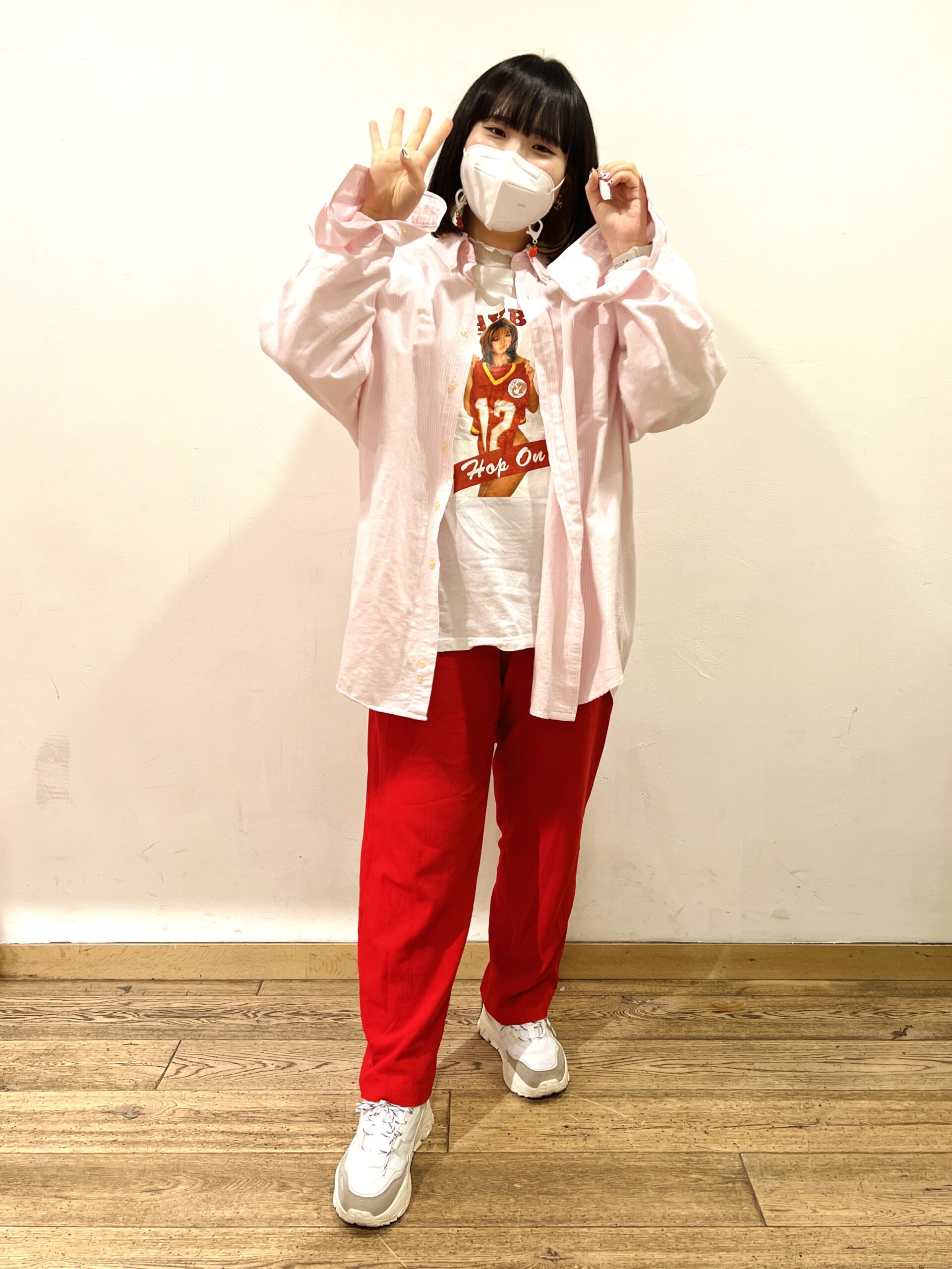真っ赤のパンツとロンTの赤が同じなので合わせて、