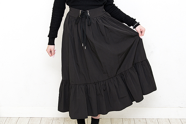 「モデルの『とくいちょまちゃん』がやっているフリマでGETしたスカート! サンプル品でこの世に1つしかなく、すごく気に入っています♡ 膝下がフリルでボリュームがあり、脚がさらに細く見えちゃう効果も♪」