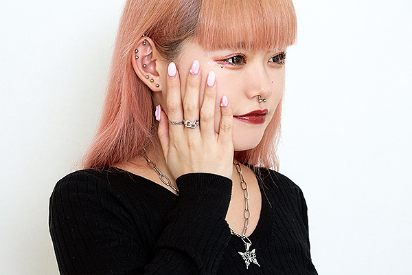 髪がPINKなので、全体の統一感を出すためにネイルとメイクも同じ色で揃えたんだって♪ ちなみにアクセサリーは全部シルバーで統一しているんですよ!